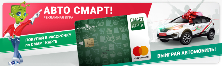"Плати Смарт-Картой "Банка Москва-Минск" и выиграй автомобиль! Совершай покупки на сумму от 50 рублей и верь в удачу! Подробности на сайте mmbank.by"